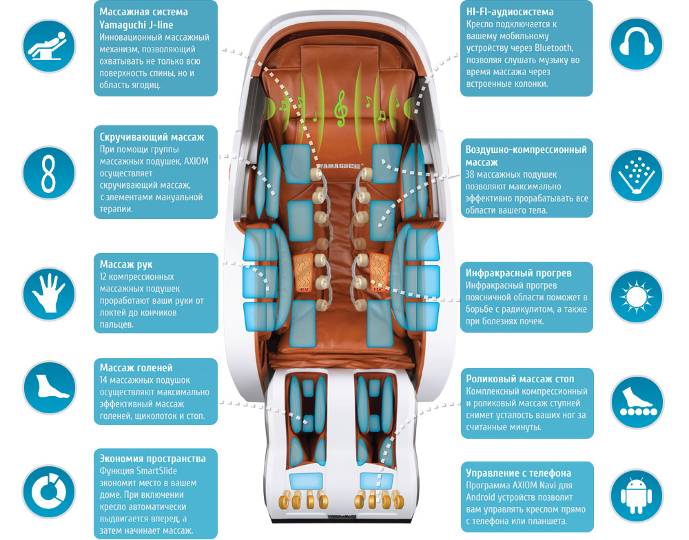 | Зоны массажа | Шея, плечи, спина, поясница, руки, ягодицы, бёдра, икры, стопы |